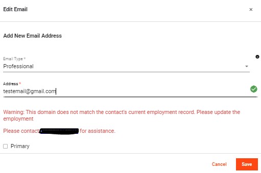 When an email is added or changed there are validations to see if the email domain matches the list of domains we have for their employer. Example, adding an email for a Ford Motor Company employee would show a warning if an email with GMC.com is added. Additionally, a check is performed to ensure the email is not already connected to another person in the system as that smells an awful like a duplicate.