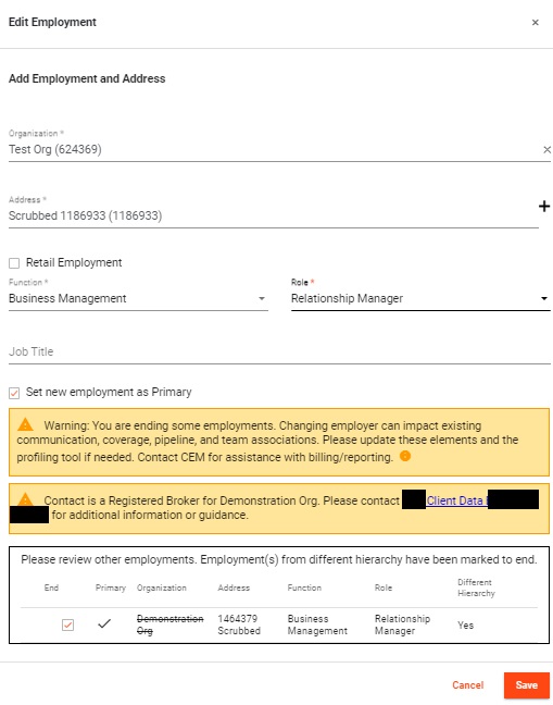When adding a new employment the user is prompted to keep or end current employments. Also, the new employment firm is checked against existing employments to see if the person already works for an affiliated organization.