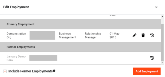 The list of current and former employments is presented in grid form. They can choose to make changes by clicking the pencil or trash can icons or add a new employment. Any client data form that allows multiple used this grid display first. Other examples are email, phone, address, and alias.