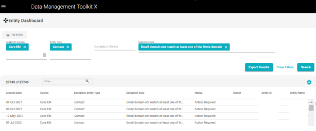The application is called Data Management Toolkit (DMT) and is a suite a tools including a data quality dashboard, bulk data update tools, data merge tools, and analytics to track team progress. The data quality dashboard allowed the client data flagged from any of our 50+ validations to be searched, assigned for review, in some cases actioned, and follow a workflow to closure. Sometimes there are duplicate firms or people added to the system even though we have several checks in effort to prevent it. DMT has five different tools to merge various types of client data. Each merge includes over 30 complicated data checks that must pass before the data is merged. Once past checks the tools then merge duplicate records without losing critical data and notifies downstream systems of the merge. There are a dozen tools to allow Client Data to update large sets of data in bulk. Some examples are creating contact records and updating email domains.